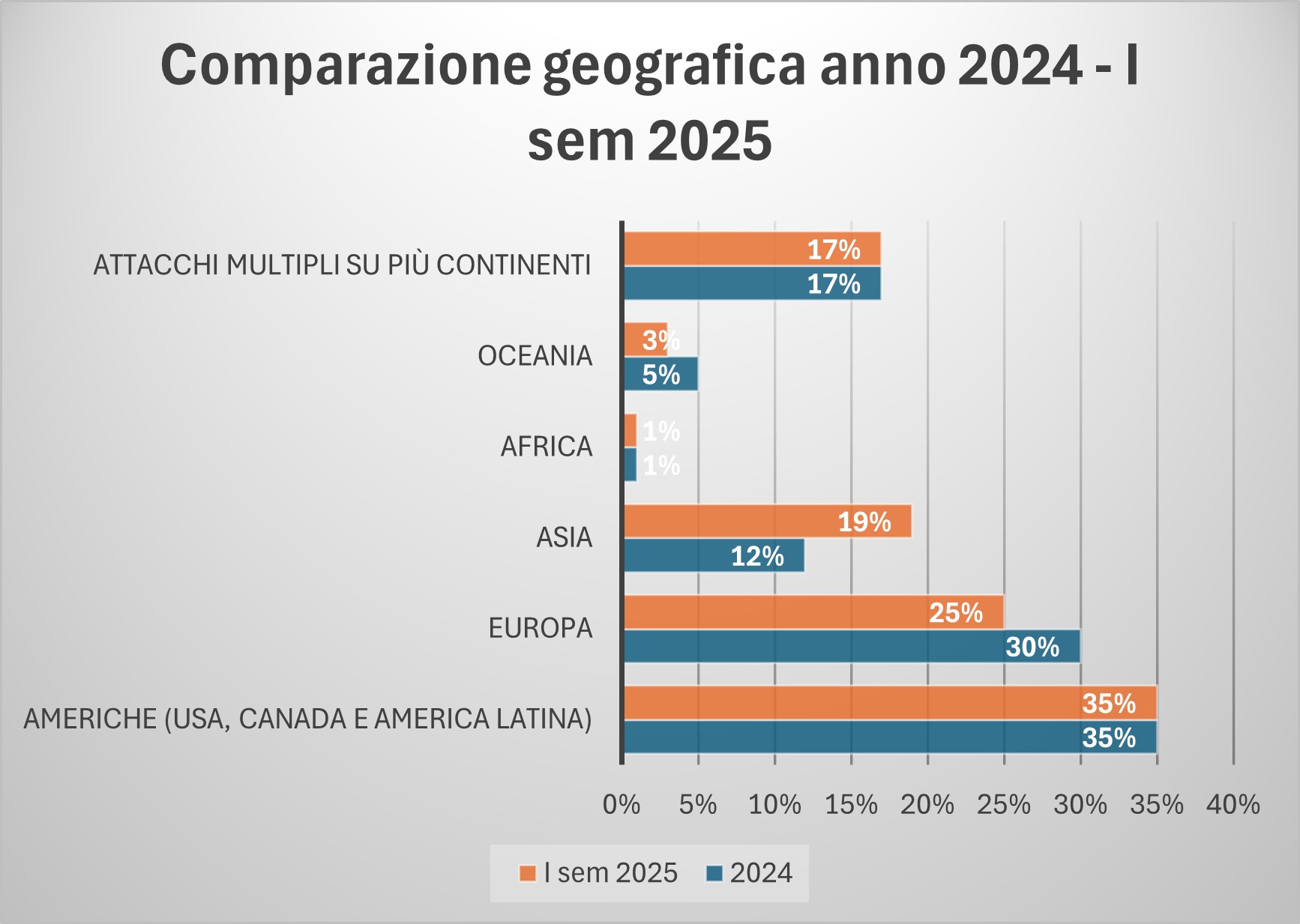 Concentriamoci sulla comparazione tra l'anno 2024 e il I semestre 2025, per analizzare i dati di dettaglio. Partiamo dalla distribuzione geografica degli attacchi.