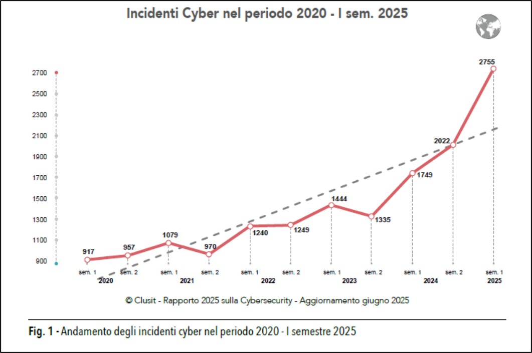 Nel periodo gennaio 2021 - giugno 2025, il trend degli incidenti dovuti ad attacchi che hanno avuto impatti significativi in termini economici, tecnologici, legali, reputazionali sono aumentati drasticamente. Su un totale di 15.717 incidenti, ben 2755 sono occorsi nel I semestre 2025, come riportato nell'immagine seguente.