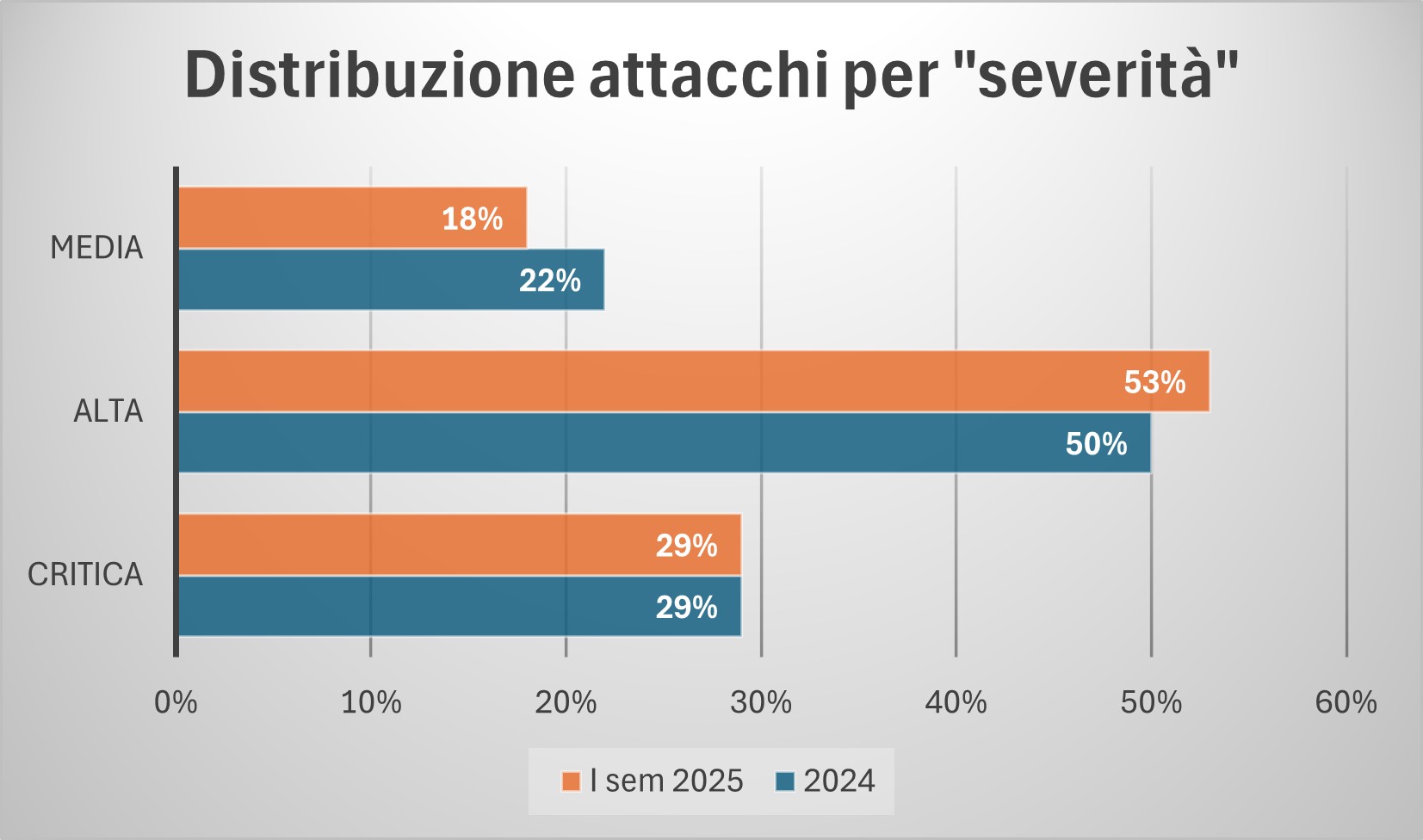 Per quanto riguarda la severità degli attacchi con impatti significativi (Media, Alta o Critica), si confermano il numero di impatti critici, mentre diminuiscono in percentuale quelli a criticità Alta.